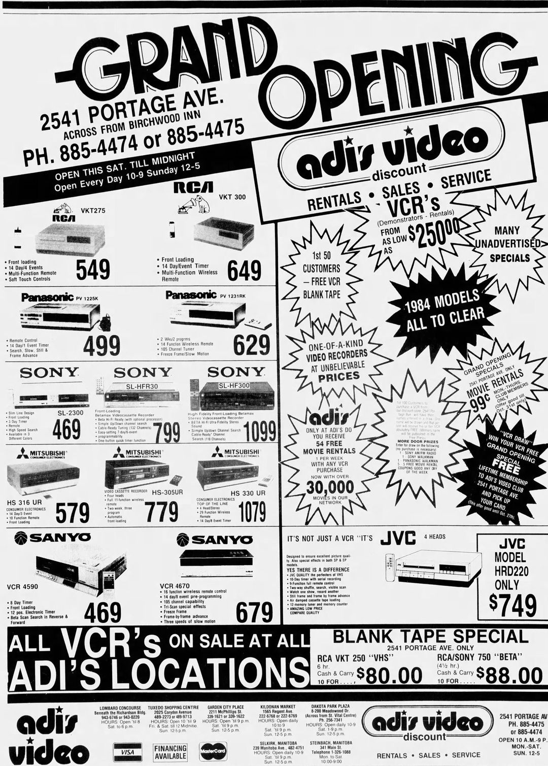 Video Zone on Academy Road had one wall of Beta tapes and the other wall had VHS. For some time, I believe you could even rent a Betamax to watch your rented video. Not sure when Adi's arrived on Academy Road but I thought a year or two later. Multiples of certain video stores started to arrive until there was well over a hundred and perhaps just under 200 store renting videos if you eventually included adult and 7/11 stores.